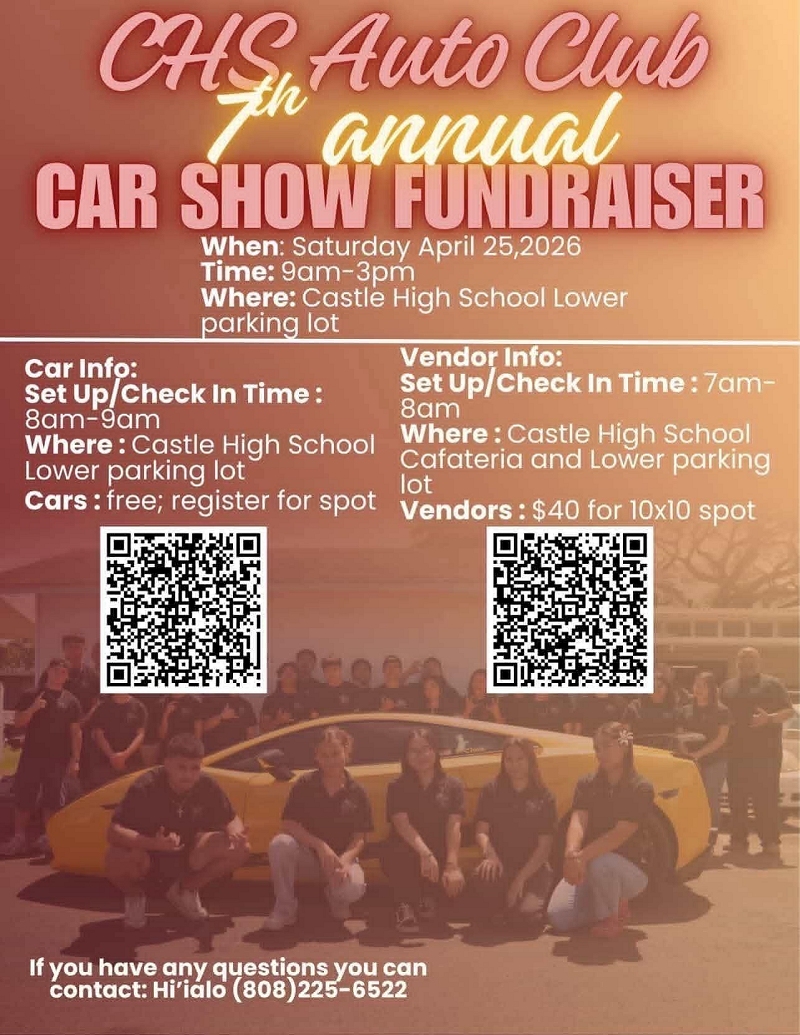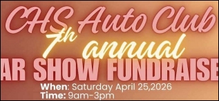 2026 CHS AUTO CLUB 7TH ANNUAL CAR SHOW FUNDRAISER. Saturday, April 25th, 2026 at Castle High School lower parking lot from 9 a.m. till 3 p.m. Click on the flier found towards your right for more information!