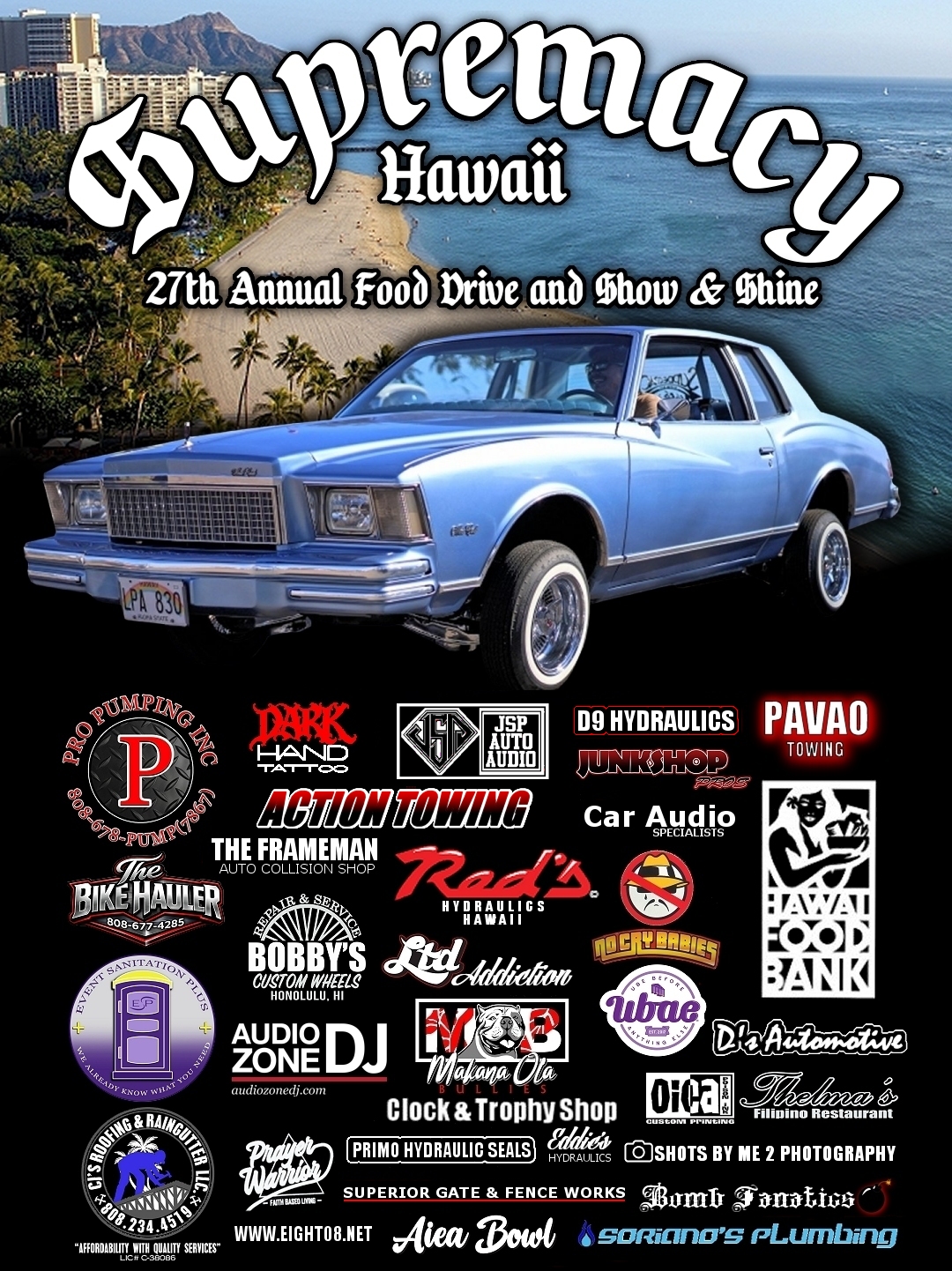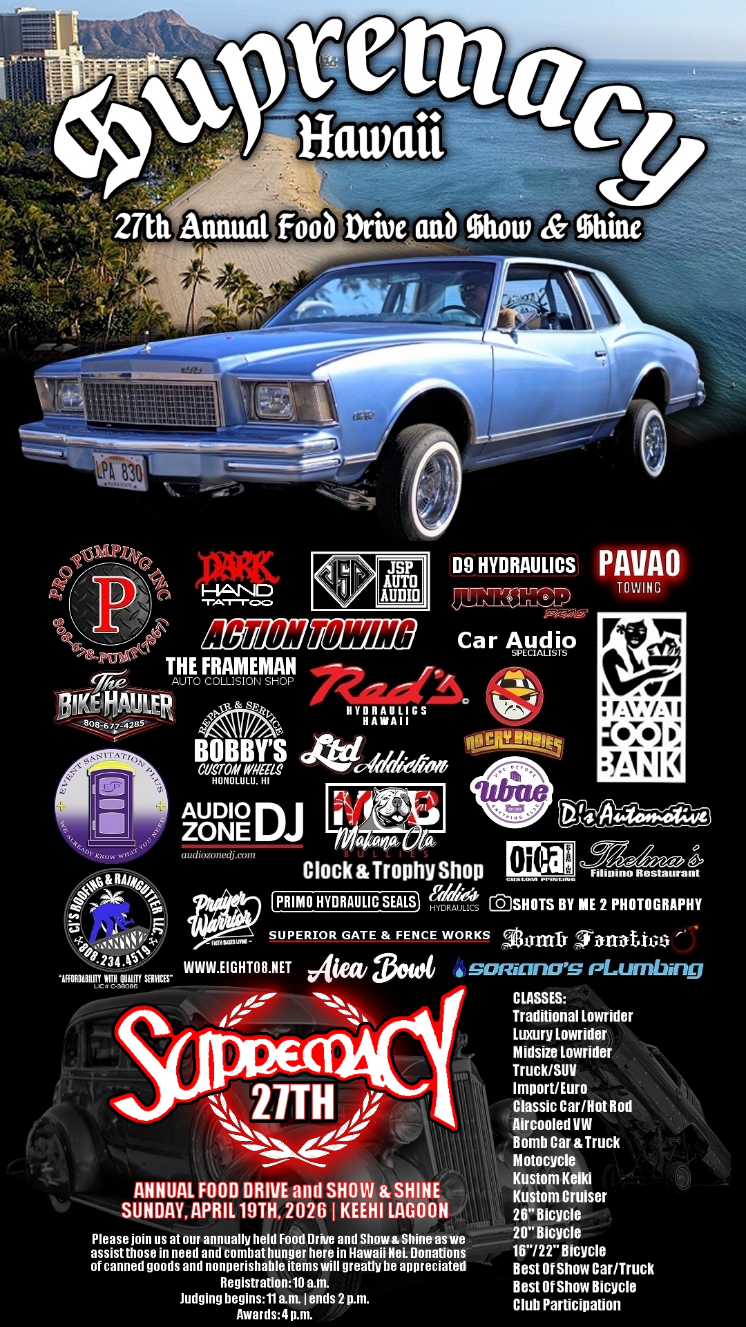 2026 SUPREMACY CAR CLUB 27TH ANNUAL FOOD DRIVE AND SHOW & SHINE. Sunday, April 19th, 2026 at Keehi Lagoon. Click on the flier found towards your right for more information!