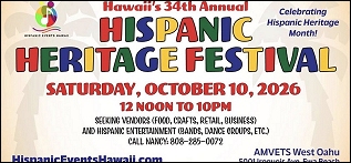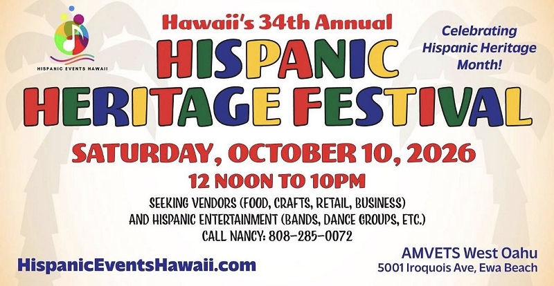 2026 HISPANIC HERITAGE FESTIVAL. Saturday, October 10th, 2026 at AMVETS West Oahu from 12 p.m. till 10 p.m. Click on the flier found towards your right for more information!