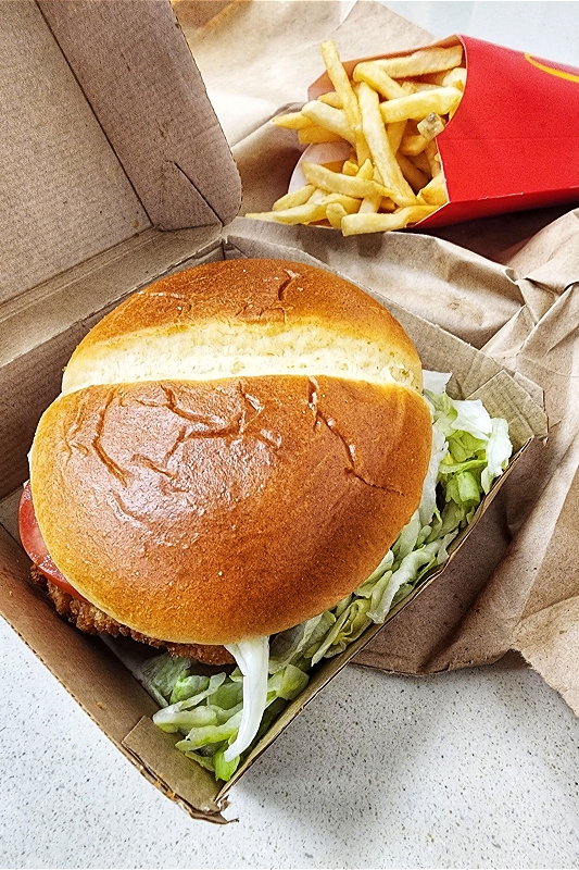 Pictured above and below is a Deluxe McCrispy from McDonalds. Their Deluxe McCrispy features a crispy chicken fillet with shredded lettuce, Roma tomatoes, and mayo. Verdict: (4) out of (5) Shakas