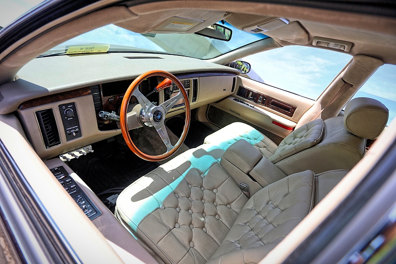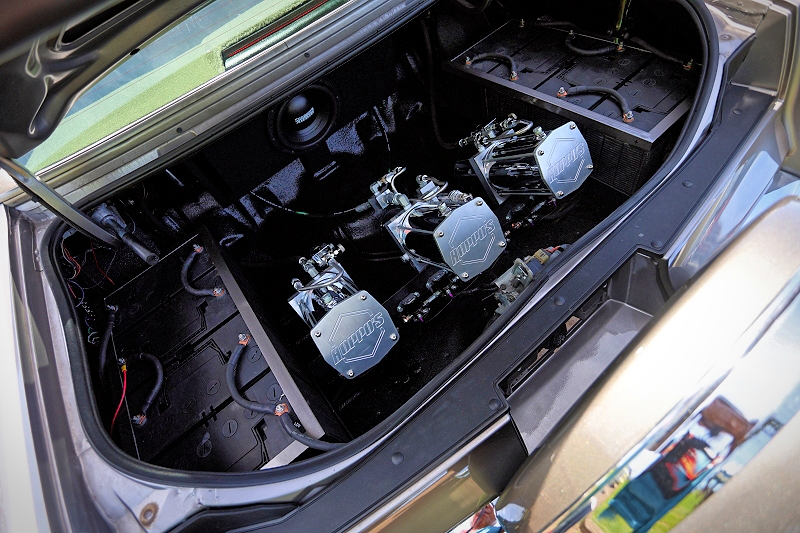 Philip Yi’s 1995 Cadillac Fleetwood rocks a (3) pump (8) batteries hydraulic suspension incorporating 22″ telescopic cylinders in the rear and 8″ cylinders up front along with high lockup ball joints for further suspension travel