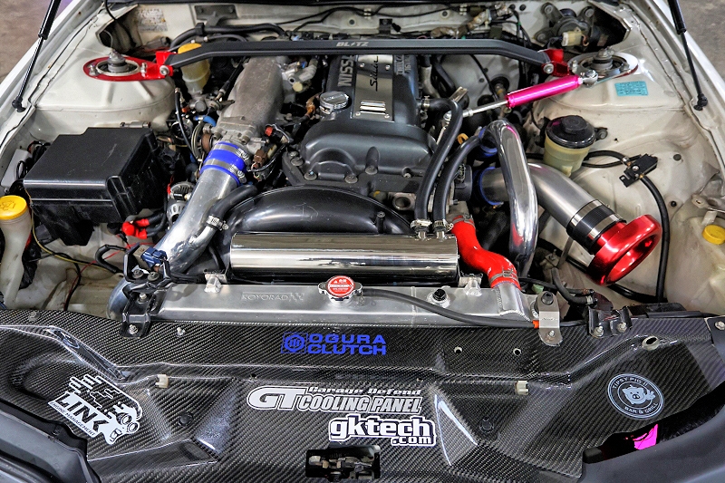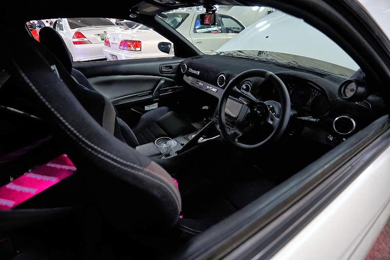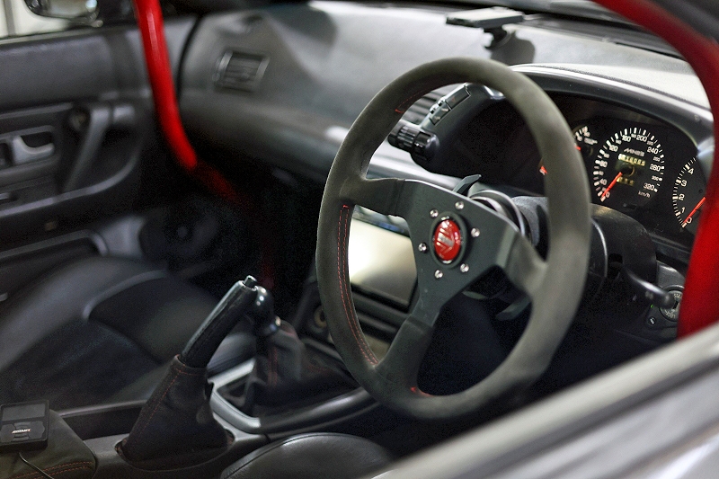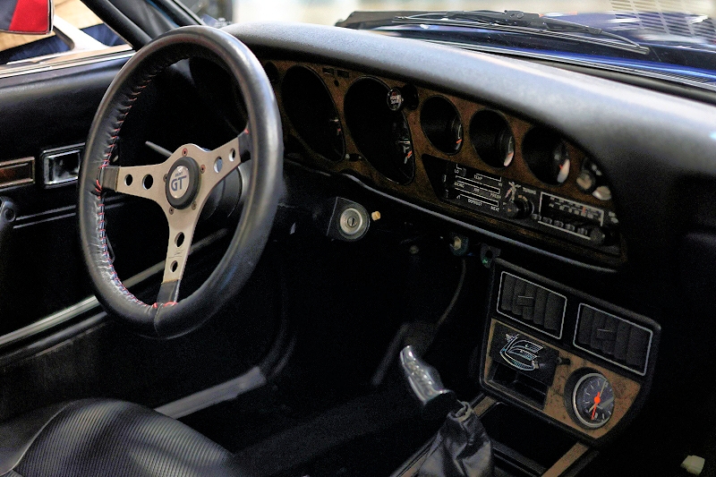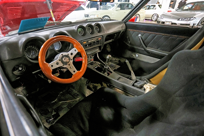 Interior necessities for Lance Sugiyama’s 1976 Datsun 280Z includes a Mizuno Works steering wheel, Vintage Quattro bucket seats, Defi Advance RS tachometer, oil pressure, oil temp, water temp, and control unit as well as Autometer Sport Comp 2 volt gauge, fuel level gauge, and AFR gauge