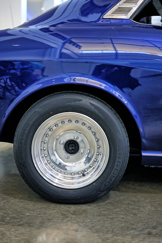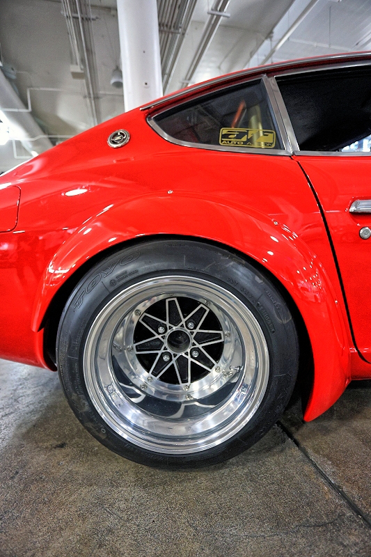 Found towards the rear of Lance Sugiyama’s 1976 Datsun 280Z are 14×11.5 SSR Jilba racing wheels wrapped in 225/50/14 Toyo tires while a Fujitsubo stainless steel exhaust dumps the gasses beneath a Works Aero rear valance