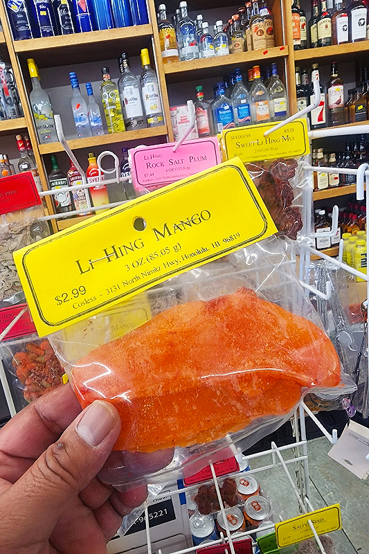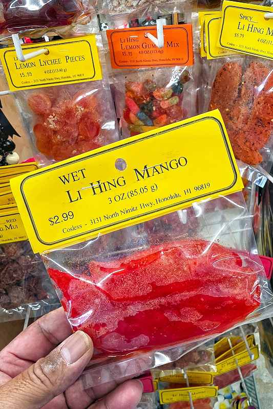 Li Hing Mui is a popular snack here in Hawaii Nei consisting of dried, salted plums with a unique sweet, salty, and sour flavor often eaten as is or used as a powder to be sprinkled over anything and everything for a tangy, savory kick. My personal favorites when it comes to a Li Hing Mui based snack are Li Hing Mui dried mango as pictured above and Wet Li Hing Mui dried mango as pictured below. Tangy, sweet, and full of mango flavor goodness. Cravings satisfied!